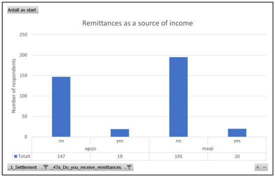 The refugees were also asked to provide information about other sources of income. The intent was to find out if any of the refugees received remittances from friends or family in South Sudan or elsewhere, as shown in Figure 2 below. Unfortunately, very few refugees receive remittances, mainly from relatives, which demonstrates the refugees’ limited income opportunities and precarious economic situation in rural settings.
