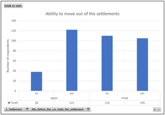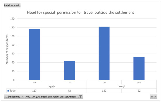 The refugees were asked about the requirement for special permissions to travel beyond the settlements as shown in Figure 4 below. Many confirmed they did not require any special travel permissions to travel within the host district. However, those travelling outside the host district need special clearance from the Office of the Prime Minister. The OPM confirmed that this is required for protection purposes. This requirement primarily affects refugees who have engaged in trade activities and cross-border trade. For example, some traders buy fish from South Sudan and sell it in the settlements, while others buy fresh food in Uganda and sell it in South Sudan. In addition, cross-border trade is practised in settlements close to the border entry points, such as Elegu in Adjumani district. These cross-border exchanges illustrate the need for mobility as a strategy for livelihoods. For the refugees, cross border mobility has symbolic significance despite the legal dilemmas about entitlements, rights, and responsibilities associated with their refugee status. Besides, the need for socio-ritual continuities such as burial and marriages is critical for social identity. In addition, mobility was identified as an essential coping strategy amidst the fear of renewed or continued violence and insecurity in South Sudan. Thus, durable solutions should be embedded in the choices and strategies deployed by the displaced people [53,54].