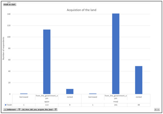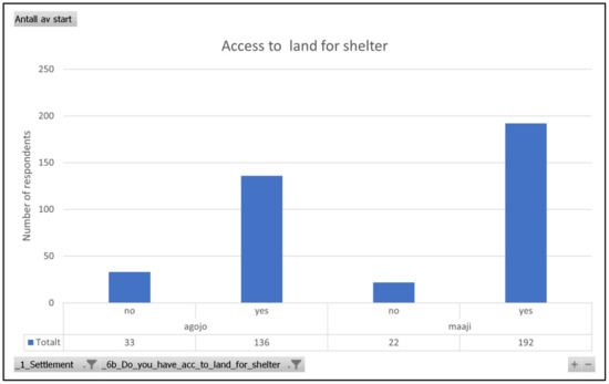 Land—providing land for shelter and farming is a crucial policy strategy for hosting refugees in Uganda. The government negotiates with the local communities to acquire the land for settlement. Land is a vital resource for refugees whose traditional livelihoods are land-based activities such as crop farming and pastoralism. Most refugees confirmed they have access to shelter plots of varying sizes, as shown in Figure 5. Those without shelter plots arrived as single persons (those without families) and are usually allocated plots that they share with other single persons. Nevertheless, there are substantial variations in the plot sizes between the settlements depending on the availability of land. For example, in Nyumanzi, the average plot is 20 × 30 m; in Mirieyi 10 × 10 m; and in Maaji 30 × 30.