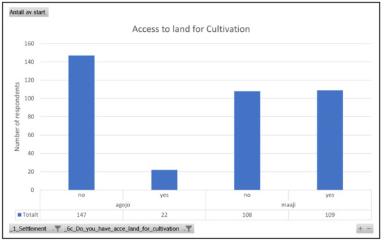 Regarding access to land for farming, there is considerable constraint, as shown in Figure 6. There are more refugees with access to cultivation land in Maaji than in Agojo. The refugees reported that the soils in Maaji are relatively fertile, and the rainfall pattern favours agriculture. Meanwhile, in Agojo, the land is mostly rocky, and stone quarrying was a significant economic activity. In Mirieyi, there is an acute shortage of cultivation land.