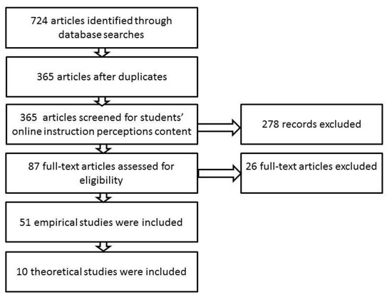 After screening 724 articles, 61 articles met the criteria. Specifically, articles were then sorted into two former sections known as theoretical and empirical papers. This scoping review further discussed students’ online instruction perceptions in terms of positive and negative aspects, followed by factors influencing online instruction perceptions with implications.