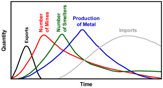 A way of visualising the ‘finite’ nature of metal and mineral resources was published by Hewett [6]. Hewett noted that the typical pattern of mining across Europe and the USA, shown in Figure 1, started with a rapid rise in exports, followed closely by an increasing number of mines and smelters, which reach a peak and then decline. Total production also rises to a peak and then declines, eventually meaning demand is met by imports instead. Mining was influenced primarily by geology, technology, economics and political factors. The overall rise-and-fall pattern was controlled by the finite size of mineable metal deposits as much as market prices versus mining costs, technological options and socio-political issues such as wars, labour and legal or governance aspects (especially government vs. private ownership, itself a complex quagmire to unravel).