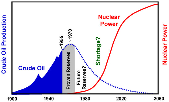 Hubbert [7] first began to examine petroleum production from the same kind of thinking as Hewett had carried out for metals, proposing that a ‘peak’ curve could be similarly adopted for oil. Hubbert based his theory of ‘peak oil’ on the rise and fall of historical oil fields, known reserves and likely additional reserves yet to be found. A major concern of Hubbert’s was not merely the timing and magnitude of any specific peak but the consequences of running out for American society and the need to import oil—a critical issue which is often overlooked [8]. Given that nuclear energy was the new energy source being strongly promoted in the mid-1950s (leaving aside the obvious difference between electricity and liquid transport fuels), Hubbert explored the transition from oil to nuclear, shown in Figure 2. The primary challenge Hubbert foresaw was the gap after the peak in oil production before nuclear energy rose to replace it—in others words, a significant potential energy shortage during this unplanned transition. Thus, despite misunderstandings about Hubbert and his life’s work, he was not worried about ‘running out’—rather what we do about it. Put simply, it was about transitions from one resource to the next and how to govern and manage that transition effectively—what we now think of as sustainable resource use [8].