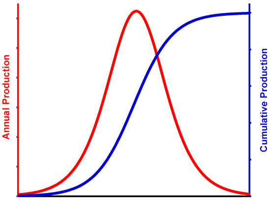 Representation of Hubbert’s conceptual peak and cumulative production curves.
