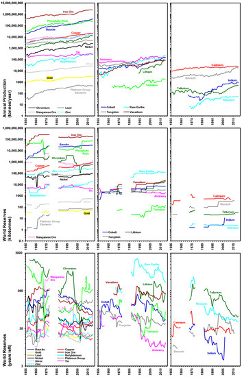 - Global Reserves and Mine Production—the annual Commodity Data/Mineral Commodity Summaries published by the former U.S. Bureau of Mines and now the U.S. Geological Survey, years 1955 to 2020 [22,23,24].