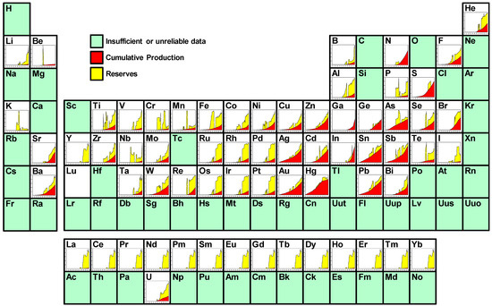 Hubbert-style curves of cumulative production (red shading) and reserves (yellow shading) for numerous elements inserted within the Periodic Table of the Elements.
