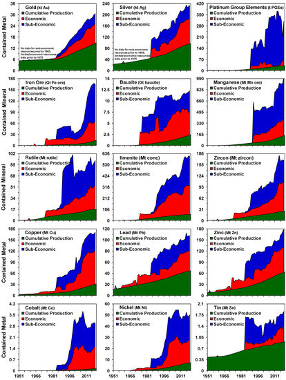 Cumulative production, economic and additional sub-economic resources over time for primary metals and minerals in Australia (data updated from [30]).