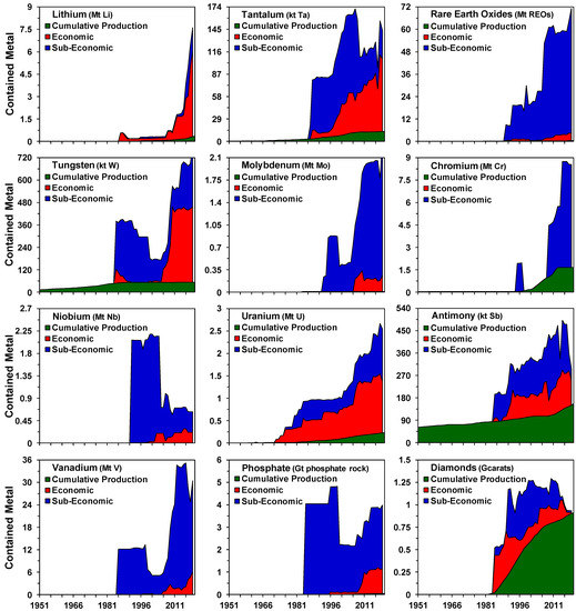 In the mining industry there are strict codes or guidelines which govern the assessment and reporting of mineral deposits which could be mined. There are two types of categories used to assess mining potential, namely ore (or mineral) reserves and mineral resources, as used in codes in Australia (JORC), Canada (NI43-101), South Africa (SAMREC), Europe (PERC) and the USA (IG7) (amongst others; see [9]). Reserves represent short-term mine plans and are expected to be profitable, whereas resources are longer-term potential and geologically well understood but have less certainty on their economics or other aspects. Resources can be stated as including or excluding reserves. Over time, it is common for a mining project to show resources being upgraded to reserves and then become production, with total endowment increasing concurrently (i.e., cumulative production plus remaining reserves and resources). Whilst this growing endowment pattern is now well established for many mining projects around the world (e.g., [10,11,12,13], there are exceedingly few studies of national endowments over time (especially other than common metals such as copper, gold, iron ore).