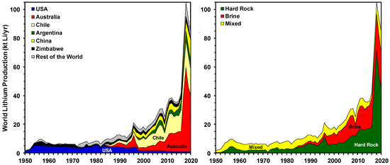 There were concerns emerging in the late 2000s that global lithium resources were insufficient to meet demand if electric replaced combustion vehicles, although as shown by Mohr et al. [50], there was clearly an abundance of potential lithium—the critical issues were what was economically recoverable and comparing the relative social and environmental impacts of brines versus hard rock mines. The rise of electric vehicles, however, began in earnest in the mid-2010s, again leading to concerns about global lithium resources and supplies.