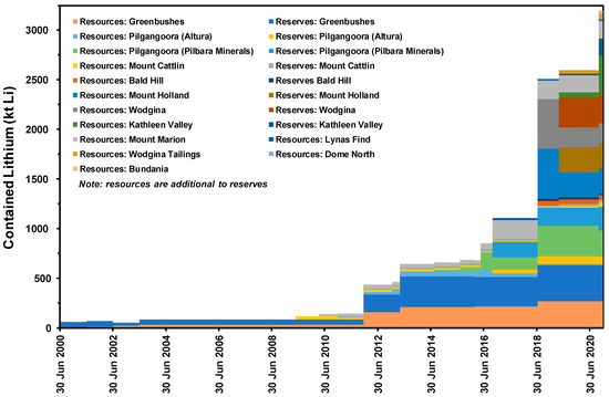Given that Western Australia is home to almost all of Australia’s lithium deposits, a detailed analysis of reported reserves and additional resources by individual deposit over time is shown in Figure 9 (all data from regular extracts from the MINEDEX database system; [53]). Until ~2010, the lithium sector was represented only by Greenbushes, with numerous deposits now discovered and developed since this time (e.g., Mount Cattlin, Mount Marion, Bald Hill, Mount Dove, two mines at Pilgangoora and the re-purposing of the closed Wodgina tantalum operation into a lithium producer). Over time, the substantial increase in reserves and additional resources clearly correlates with increased Australian production, where lithium now exceeds the export value of uranium by 3–4 times (data from [34]). Another interesting aspect of these results is that the old tantalum tailings at Wodgina are now reported as a lithium resource. Based on the geology of Western Australia, it is highly likely that success will continue in finding new lithium deposits and expanding known ones, demonstrating the role that exploration plays in resource endowments.