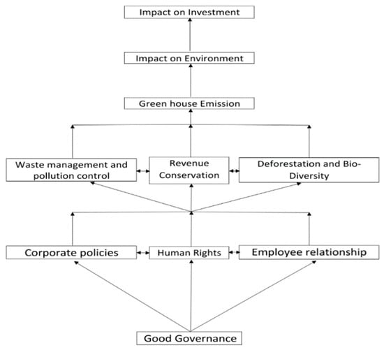Different authors have studied the ESG environment by using different methodologies to achieve the desired outcomes. Various challenges to integrate ESG investors’ preferences in the clothing industry has been determined by a fuzzy multicriteria decision-making method and is focused on commercial solutions as the key factor [59]. The ISM analysis illustrates that the corporate policy, which is a governing commercial solution, is the key driver towards ESG and validates the outcomes of the previous research. Similarly return and risk with good governance ESG has been studied by previous researchers using the MCDM technique [60] and the same result was observed as in this research; that is good governance is the strangest driver to achieve the investment impact on ESG. Eccles et al., [61] focused the non-financial data and social construction as the crucial aspects of ESG by an in-depth literature analysis and this study observes that the non-financial performances, such as human rights, employee relationships, and corporate policy are influencing ESG toward investment. Similarly, the result showed that environmental impact is the key objective to achieve the investment impact which validates the outcome of the previous research where researchers focused on the environment factor for the construction of building. [62]. Some studies have also used the ISM model, which focuses on good governance with a proper management mission and vision as an important driver [55,63]. Good governance with a management vision drives environmental performance with green design and green manufacturing using ISM techniques [55]. Similarly, the management vision resulted as the major driver for organizational performance using the ISM analysis [63]. The outcome of this study shows that good governance is driving the investment impact through environmental impact which supports the results of previous studies [55,63].