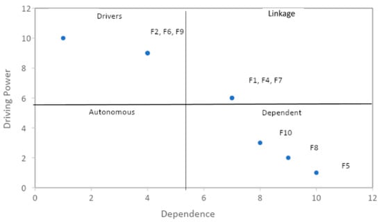 MICMAC firstly requires factor dependence and driving powers as inputs [57]. Then it requires factor dependence and driving powers as inputs that categorizes the factors into four types (Figure 2). Autonomous variables (factors with weak dependence and driving powers) are shown in the first quadrant. Dependent variables (factors with strong dependence but weak driving powers) are shown in the second quadrant. Linkage variables (factors with strong dependence and driving powers) are shown in the third quadrant. Driving variables (factors with weak dependence powers and strong driving powers) appear in the fourth quadrant [58].