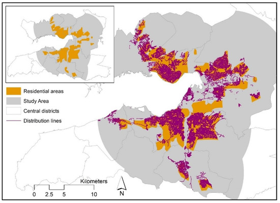 Natural gas distribution lines and residential areas in the study area. Source for the residential areas: İzmir Metropolitan Area Master Plan [39].