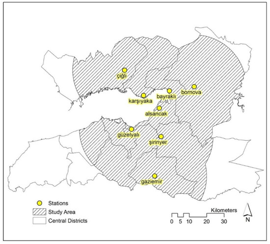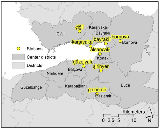 Air pollution data was retrieved from the Ministry of Environment and Urbanization’s National Network of Air Quality Monitoring. The monitoring and recording of hourly pollutant gas emissions, and compiling them in inventories, indeed became compulsory with the enactment of the Air Quality Assessment Directive in 2008. However, the directive took a few years to be implemented since setting up the system required time. There are 23 monitoring stations in İzmir recording different pollutants, yet not all of them are available at each station for each period. The most comprehensive data has been available since 2010 and, thus, the base period was taken as the 2010–2011 winter season. PM2.5 is not monitored regularly in any stations, whereas PM10 records are available in eight stations (Figure 3), all of which are located in the central districts. The closest station out of İzmir is located in Manisa, the neighboring city to İzmir which is located in the north–eastern part of the city. However, the geographical thresholds between the two cities, particularly the hilly and woodland areas, such as Mount Spil, a 1500 m tall mountain covered with forest, prevent PM10 flows to a certain degree. In addition, Manisa station is approximately 26 km away so that it is disregarded as a result of it being beyond the range of the model outputs. Although more observations are better in statistical terms, the number of stations were limited to 22 [41], 13 [35], 10 [34], 8 [31], 7 [33], and 6 [28].