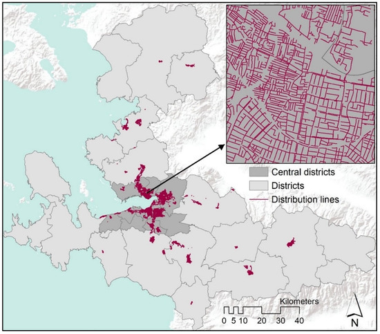 The distribution lines shapefile (Figure 4) is retrieved from İzmirGaz, the only authorized firm to distribute natural gas in İzmir. The shapefile is in vector format and the line attributes cover the investment year and the diameter of the pipelines. The investment year covers a period from 1 January 2005 to 19 December 2018.