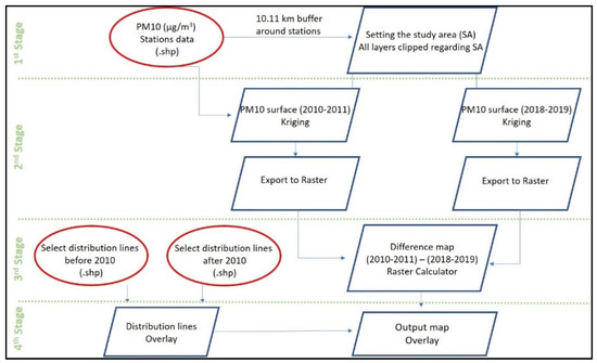At the final stage, the PM10 concentrations and natural gas distribution lines are overlayed with regard to the observation periods and investment dates. The 2010–2011 period is overlayed with the lines invested before 2010, and the 2018–2019 period is overlayed with the lines invested before 2010. The selection is done with the “Select by Attributes” option with regard to the investment years. Finally, the difference surface is then overlayed with the natural gas distribution lines with regard to their investment years, as before and after 2010, in order to interpret the level of changes in emissions spatially at the local level.