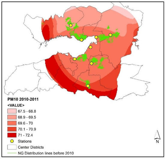PM10 concentrations (µg/m3) and natural gas distribution lines in the 2010–2011 winter season.