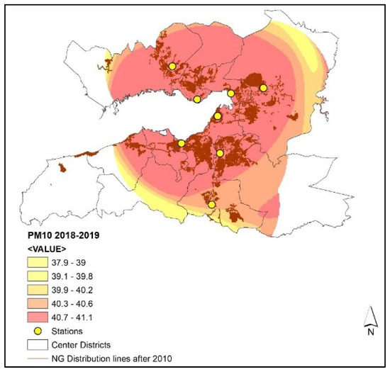 PM10 (µg/m3) concentrations and natural gas distribution lines in the 2018–2019 winter season.