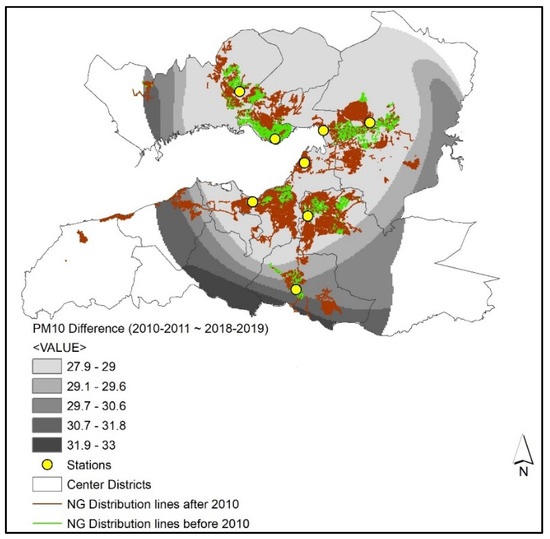 Difference of PM10 (µg/m3) concentrations and natural gas distribution lines between the 2010–2011 and 2018–2019 winter seasons.