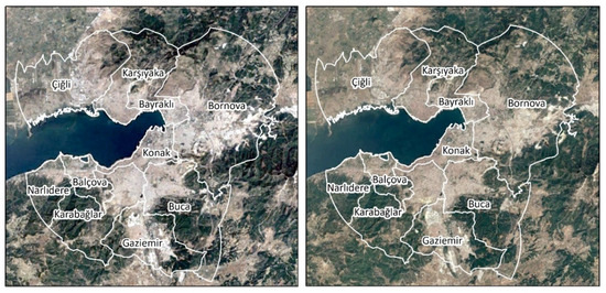 Air pollution has been one of the most significant problems in İzmir. It is the third largest province of Turkey with a population of 4,394,694 in 2020 [59], being located in the western part of the country, having a long coastal line to the Aegean Sea. The province has 30 districts in total, while 70% of the population inhabits 11 central districts located along the gulf making up the City of İzmir, while 10 of them (Karabağlar, Buca, Bornova, Konak, Karşıyaka, Bayraklı, Çiğli, Gaziemir, Balçova, and Narlıdere) are within the study area.
