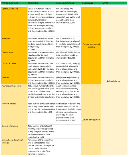 We then compared MapMI to the CCCM’s composition. In a nutshell, CCCM is designed to help identify local strengths and opportunities and benchmark cities against similar urban centers using both quantitative and qualitative data. The quantitative information is captured in 29 indicators relevant to 9 dimensions reflecting 3 major facets of the cultural, social, and economic vitality of cities. These data are complemented by qualitative information including features ranging from the main cultural sites to the development of policy strategies and infrastructure (e.g., funds, tax incentives, creative incubators, and fab labs) that demonstrate a city’s commitment to supporting culture and creativity (see for more details [56]). Figure 1, Figure 2 and Figure 3 display the comparison between the properties of the indicators in the two datasets. Starting from the CCCM’s properties, we matched the CCCM indicators (e.g., sights and landmarks) with the corresponding MapMI ‘main activity’ categories (e.g., churches, architectural buildings, parks, and public spaces). As the datasets’ indicators did not always match, we identified the MapMI indicators that were closest to the CCCM ones or substituted them with more meaningful ones given the unit of analysis (NIL as opposed to city).