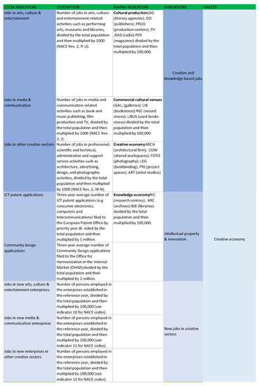 As suggested by Lazzaretti, Capone, and Secilmis [80], only a few studies—such as DCMS [1]—follow standardized metrics in the definition of CCIs and assess their performances and outcomes in the areas in which they are located. Additionally, most of the available research refers to the national level (see for a similar analysis [55]). Finally, the non-coordinated variety of measurement tools and approaches [81] does not favor evidence-based policy [56,72,82,83] Available data for comparative analysis either focus on a very limited set of indicators (such as Eurostat data) or take a small geographical area as a reference [84].