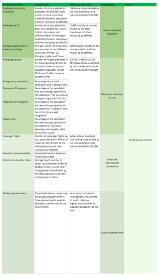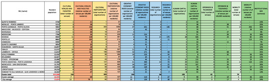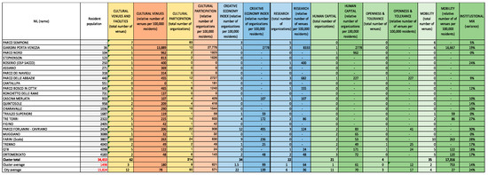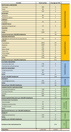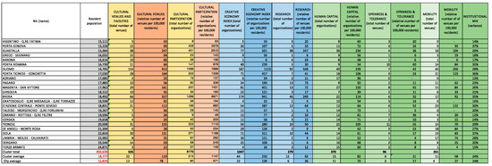 The Human Capital and Education dimension included within Figure 3 was defined considering three types of educational organizations: schools, universities, and academia. These are organizations involved in training individuals for the arts and cultural sectors, even amateurs, notwithstanding the ambiguous differentiation between production, participation, and practice in the arts. We felt that number of graduates from specific universities was not the best proxy to define the presence of human capital at the neighborhood level.