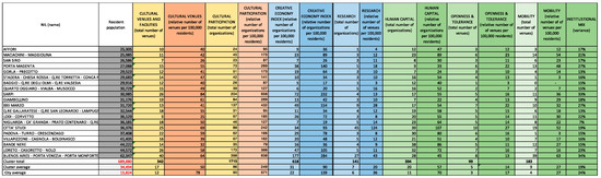 The Cultural and Creative Cities Monitor (CCCM) is a valuable instrument to measure and compare European cities’ cultural and creative vitality [56,85]. It allows for the comparison and ranking of cities, including Italian ones, on different dimensions, making it possible for policymakers to develop strategies related to their development [56]. However, critical methodological limitations still exist, related both to the tool and the potential behavioral implications it generates [86].). Taking the city as a unit of analysis for urban policy purposes may be misleading, as it considers cities to be homogeneous within their boundaries. Quite to the contrary, there is ample evidence of differences in city texture at the neighborhood level, often explaining or leading to those social and economic inequalities that urban policies aim to address [41].