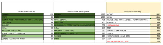 In the case of cultural participation, it is interesting to note the NILs in the top ten list for specific diffused events, but not in the overall top ten list for cultural participation: Porta Garibaldi, Porta Vigentina, and Lambrate are heavily characterized by their involvement in more than one diffused event; Moncucco and Gratosoglio are particularly active due to the presence of cultural associations and aggregation centers; and Loreto, Dergano, and Lodi leverage both events and associations in order to mobilize local communities and activate cultural participation. Given the high level of participation in diffused cultural events, Porta Genova is in the top ten list for total cultural vitality, even though it is not in the top ten list for cultural venues. Generally speaking, though, the neighborhoods rich in landmarks are also attractive in terms of temporary events.