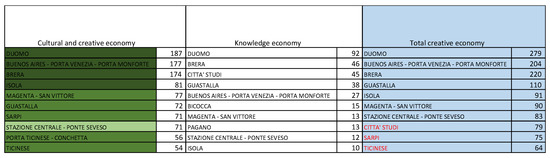 The characterization of CCI within Figure 2 has used the following criteria. Cultural production groups companies and not-for-profit organizations involved in cultural production activities across different industries (i.e., audio-video, books, magazines, and newspapers). Commercial cultural venues include art galleries, bookstores (new and used books), and record stores. Creative economy groups professionals from the so-called creative industries. To highlight organizations that could be defined as creative (and not mere service providers), architects and photographers in the sample include only those participating in the “off” initiatives taking place during the Milano Design Week (as known as Fuorisalone). As it emerges from Figure 2, the shift in the focus based on the neighborhoods and on one city, together with the methodology followed to create the dataset call for a different characterization of the CCCM indicators, therefore a “greater distance” from it. At the same time, it makes possible to reach a high level of granularity in CCI definition and a more precise operationalization.