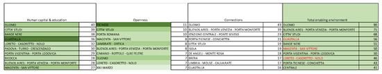 Figure 11 explores the concentration of Enabling Environment indicators. As happened for the dispersion of individual components of the cultural and creative economy, some NILs that are not in the top ten list for the global indicator are still part of the top ten indicators of the subdimensions. Therefore, it is interesting to note the relevance of two large neighborhoods—Moncucco and Niguarda—due to the concentration of schools/training centers in the arts and creative industries. Moncucco also hosts university residences, while Villapizzone is rich in schools and religious communities, highlighting the social diversity.