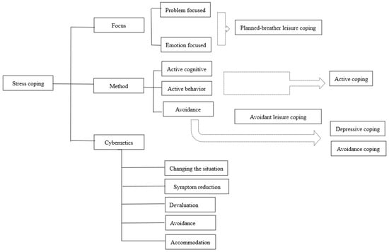 Later research on stress coping generally involved attempts to further clarify and refine the dimensions of the WCCL and the CCS. Iwasaki [32] proved that leisure worked as one strategy to cope with daily stress and could contribute to well-being. It was further developed into two styles: the planned-breather leisure coping style (PBLCS) and the avoidant leisure coping style (ALCS) [12]. PBLCS combines both problem-focused and emotion-focused coping with a functional goal to reduce stress and stay positive. By contrast, ALCS is an escape tactic to either avoid or deny the stress [3]. Accordingly, active cognitive and active behavioral coping are combined into one method named “active coping” and split avoidance coping into “avoidance coping” and “depressive coping” [9]. Taking the above together, stress coping strategies in the existing literature can be summarized into the following figure (Figure 1).