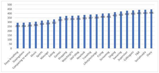 In the item scales, “0” represents that the stress coping strategy was not used or not applicable. Thus, “frequency of adoption = 470−n” was used to count the frequency, with “n” representing the number of non-uses of a stress coping strategy. The results are depicted in Figure 2. All of the collected 25 coping strategies were used by at least 62% of the 470 participants. Writing in a diary (N = 446), sharing on social media (N = 443), venting to friends or relatives (N = 441), sharing with colleagues (N = 435), sharing with a supervisor (N = 432), and using curse words (N = 423) were the most frequently used strategies (90%).
