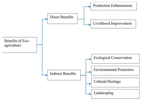 Many studies in the literature have enumerated the various benefits from the application of eco-agriculture. Rasul and Thapa [7] suggested with the reduction of external agro-chemical inputs that eco-agriculture can be economically and ecologically beneficial through increased crop yields and better soil management. Bakhsh et al. [8] found that the adoption of zero tillage technology in the rice wheat system of Punjab, Pakistan substantially increased the production of crops and hence increased farmers’ income. Their livelihoods subsequently greatly improved and poverty was reduced. Hobbs and Gupta [9] showed that conservation technologies in the form of reduced tillage, zero tillage, and bed planting not only enhance input use efficiency and lower farming costs, but also improve the livelihoods of the farmers and offer numerous environmental benefits. Hassan and Bakshi [10] discovered that the rice yield did not decline with a reduction in chemical pesticide usage in Bangladesh. This delivered higher monetary returns to the farmers while reinforcing ecological benefits for the addressed landscape and elevating sustainable social and economic well-being of the local communities.