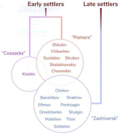 Family names can be used as quasi-genetic markers [6] and may represent a selective-neutral marker because their effect on mortality and fertility is unlikely [35]. Thus, family names can be extremely informative in studies of ancestry, admixture and migrations [35]. The transmission of family names in a series of generations through the paternal line is characteristic of many ethnic groups, so this marker describes only the male portion of the gene pool [36], which distinguishes it from true genetic markers [35]. The high informative opportunities of this method for describing the structure of populations have been confirmed by many studies [7,37,38,39]. The first Russian family names, according to the 13th century chronicles, were the inhabitants of Novgorod and throughout the 14 and 15th centuries princely and boyar (rus.—title) family names emerged, while during the 13th to 19th centuries merchant family names emerged, and from the middle of the 13th century clerical family names emerged [40]. In Eastern Siberia, in the documents of 1748, among the Russian population some Russkoustinian family names are listed, such as the Cheremkins, the Shkulevs and the Suzdalovs, all mentioned as residents of the Zashiversk ostrog, and the Portnyagins as residents of Ust-Yansk [41]. According to previously published information in the essay of native Russkoustinian Aleksey Chikachev [16], the modern lineages of the Russkoe Ust’ye are divided into three major groups of colonizers (Figure 1). The first group named as the “Pomors” are represented by 6 lineages (Shelokhovskiy, Strukov, Suzdalov, Shkulev, Chikachev and Cheremkin). The second group, the “Cossacks” is represented by one clan (Kiselev). The third group “Zashiversk” is represented by 10 lineages (Shakhov, Shulgin, Banshikov, Soldatov, Portniagin, Titov, Efimov, Malishev, Chistov and Omelchenko) [16]. The first two groups (Pomors and Cossacks) are considered as early settlers, the third one as late settlers.