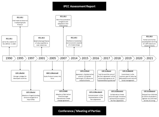 Timeline of reports and conferences on Climate Change showing international action (post creation of IPCC in 1988). (AR—Assessment Report, COP—Conference of Parties, MOP—Meeting of Parties to the Kyoto Protocol; [20,21,22,23,24,25,26,27].
