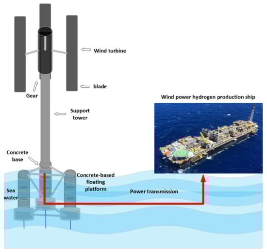 There are abundant wind resources on the earth, and offshore wind power generation is now a hot topic. At present, offshore wind turbines are divided into two categories according to the installation position and structural characteristics of their rotating shafts: Horizontal Axis offshore wind turbine (HAWT) and Vertical Axis offshore wind turbine (VAWT). The horizontal axis offshore wind turbine is named because the axis of rotation is parallel to the sea level, which is the horizontal direction. Because horizontal axis offshore wind turbines have high power and more comprehensive technology, scholars have done more research on horizontal axis offshore wind turbines before, and they are currently the mainstream models used in wind farms [1,2]. Actually, large wind turbines, or larger clusters of wind turbines in wind farms, impose a greater socio-economic cost on lower value properties [3]. Wind power hydrogen production converts the electricity generated by wind power directly into hydrogen through water electrolysis hydrogen production equipment, and produces hydrogen that is convenient for long-term storage through water electrolysis [4]. Hydrogen production from wind power is expected to accelerate offshore wind power to further reduce costs and enter the era of parity. Usually, the floating offshore wind turbines are located in the deep sea and have the advantages of abundant offshore wind resources [5]. Figure 1 is a schematic diagram of hydrogen production using a horizontal axis offshore floating wind turbine.