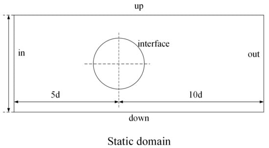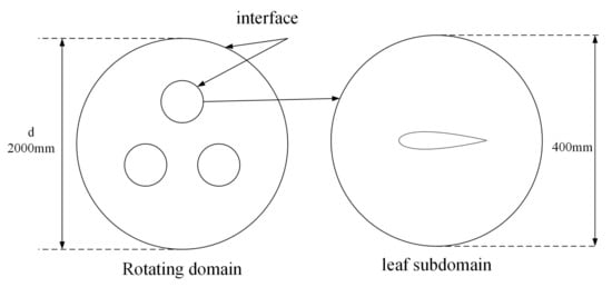 The size of the rotating domain is shown in Figure 5, and the static domain is shown in Figure 6. The chord length of the blade is 85.8 mm, and a blade domain is divided slightly larger than the circumference of the blade, and the diameter of the blade domain is 400 mm. In the vicinity of slightly larger than three blade domains, a rotation domain is divided, which is a circular area with a diameter of 2000 mm. The blade domain and the rotation domain rotate around the center of the wind wheel to simulate the state of the internal flow field when the wind wheel rotates. The remaining area is called the static domain, which simulates the state of the external flow field near the wind wheel. The boundary condition on the left side of the static domain is the velocity inlet, which is 5d from the center of the wind wheel. The entire set wind speed is 9 m/s in the positive x-axis direction, and the rightmost boundary is the pressure outlet, which is 10d from the center of the wind wheel in order to ensure that the wake of the wind after passing the wind wheel is fully developed. The upper and lower boundary forms are symmetrical, and the distance between the upper and lower sides of the static domain is 5d. The interface between the stationary domain and the rotating domain, and the rotating domain and the blade domain are all set as an exchange surface (interface) for data exchange between flow fields. The entire computational domain is a rectangular area with a length of 30 m and a width of 10 m.