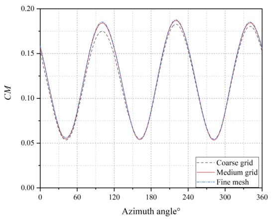 With different grid qualities, the torque coefficient of the wind wheel is changed periodically with the azimuth angle, and the torque amplitude is obtained at the same azimuth angle every 120°. In respect of coarse grid (190,000 magnitude), compared with the other two sets of grids, the torque coefficient is relatively small. At this time, the airflow around the blades is not fully calculated. Compared with the medium-quality (360,000 magnitude) grid, the calculation results of a good-quality grid (490,000 magnitude) have been slightly improved, but the calculation results have almost overlapped. In the two-dimensional grid division, 360,000-level grids are used, which can not only ensure the accuracy of the calculation, but also greatly reduce the simulation time.