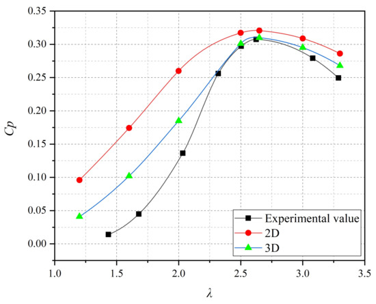 Among them, is the sweeping area, r is the radius of the wind wheel, and v is the wind speed. The Fluent software can be used to solve the instantaneous torque coefficients , , , and the sum of the three blade torque coefficients of each blade at each time step. One of the aerodynamic performance of a offshore wind turbine is reflected by the power coefficient curve and the power curve . Empirically, the calculation has converged in the 10th cycle. According to the instantaneous torque coefficient value obtained in the 10th cycle, the average torque coefficient of the wind wheel is obtained, and thus the average wind energy utilization coefficient and average power P of the wind wheel are obtained. The power coefficient is given by Equation (6):
