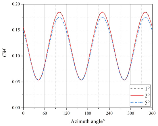 As can be seen in the figure, when the time step is 1° and 2° rotation time, the calculated torque coefficients are relatively close and have reached the simulation accuracy requirements, and when the time step is 5° rotation time, the change in interval is slightly larger, ignoring too much information on the blade surface, resulting in a small torque coefficient being calculated. Therefore, in the calculation in this study, the time step used is the time it takes for the blade to rotate 2°, and each time step is iterated at most 20 steps.