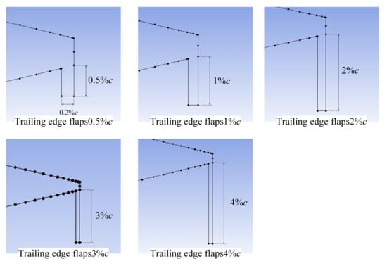This study stipulates that the length of the flap perpendicular to the chord is called the length of the flap, the length parallel to the chord is called the thickness of the flap, and the angle between the flap and the chord is the angle of the flap. Figure 12 is a schematic diagram of the trailing edge of flaps with different lengths when the flap angle is 90° and the flap thickness is 0.2% chord length.
