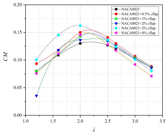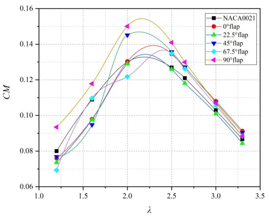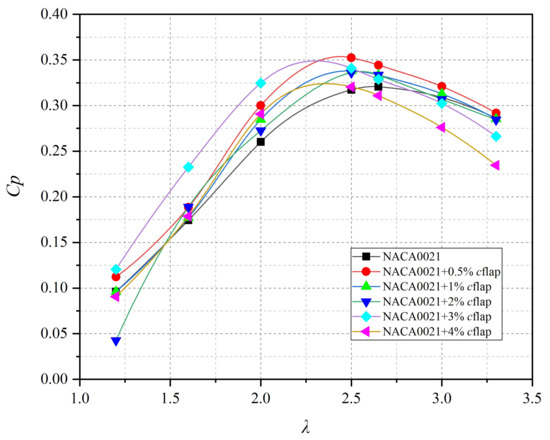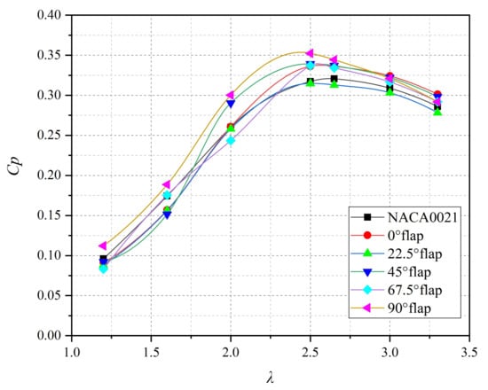 In order to better study the influence of the trailing edge flap on the vertical axis offshore wind turbine, this study studies the power coefficient of the offshore wind turbine under different flap lengths, as shown in Figure 16.