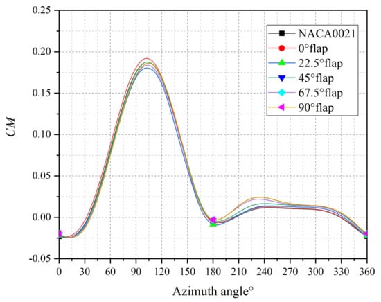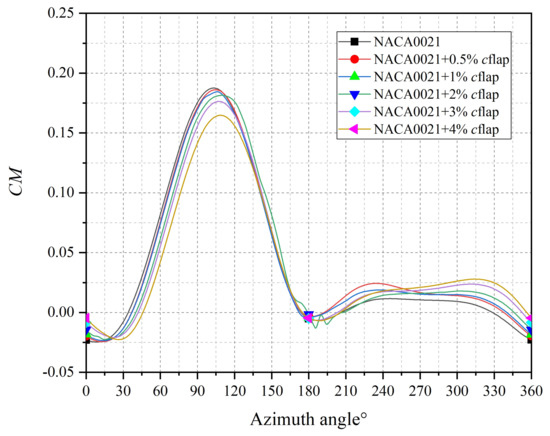 As shown in Figure 15, after we compare the change of the flap length to the torque coefficient of a single blade, it is found that the addition of trailing edge flaps will make the blade performance in the downwind region (180–360°) more obvious. Among them, the flaps of 0.5%c have the largest lifting range from 180° to 270°, and the flaps of 3%c and 4%c have more obvious lifting effects from 270° to 360°. The addition of trailing edge flaps will also reduce the performance of the blades in the upwind area. Among them, the 4%c flap is the most obvious, and the 0.5%c flap is closer to the original airfoil in this part. Combining the torque coefficient of the two parts, the flaps of 0.5%c and 3%c provide most obvious increase in performance of the offshore wind turbine.