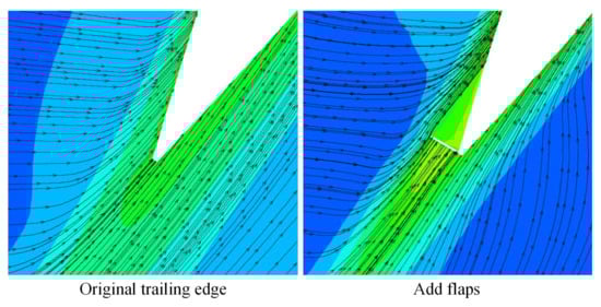 Figure 17 is compared to the streamline diagram at the trailing edge of the blade with 240° after it is added flaps. The additional trailing edge flaps play a role in guiding the flow at the trailing edge of the blade, and the flow field around the blade changes. The flaps increase the contact area of the tail, which can attract more airflow and obtain greater thrust. Especially when the blades are in the downwind area, the increase in airflow pushes the blades to rotate, and the performance of the offshore wind turbine is improved more obviously. In the upwind area, the flaps will increase the resistance to the rotation of the blades, and the torque obtained at this time will be slightly reduced.