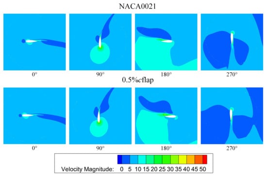 Figure 18 is compared to the airfoil with 0.5%c trailing edge flaps. When the tip speed ratio is 2.0, it is found that the trailing edge flaps can bring great changes. When the azimuth angle is 0°, the flap can reduce the low-speed vortex at the leading edge of the airfoil, at the same time, the high-speed zone inside and outside the leading edge of the blade becomes uniform, and the high-speed zone at the tail of the blade becomes smooth. With the rotation of the wind wheel, the speed of the leading edge of the airfoil increases, and the low-speed field gradually spreads to the trailing edge and middle of the blade. When the blade rotates to 90°, the middle and both sides of the tail gradually begin to be covered by the low-speed zone. In fact, in the first half of the rotation of the blades, the changes brought about by the trailing edge flaps are not obvious. At 180°, the speed around the airfoil begins to have a big difference. The installation of trailing edge flaps makes the high wind speed concentrated on the inner side of the trailing edge of the blade, and the color of the outer wind speed is obviously lightened, forming a large wind speed difference, which is beneficial to drive the blade to rotate. When the blade rotates to 270°, the low-speed area on both sides of the blade is larger due to the influence of the trailing edge flap.