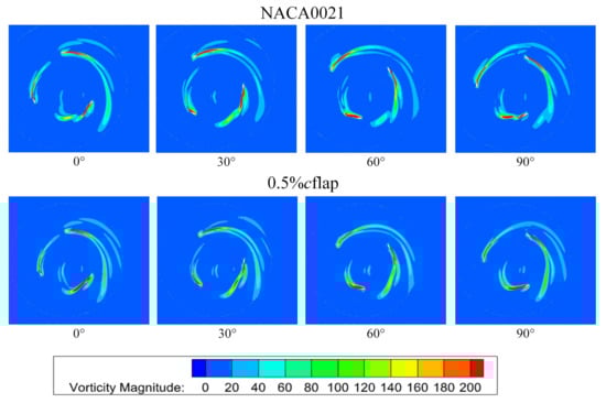 After we install the 0.5%c trailing edge flap, the vortex generated by the rotation of the wind wheel is reduced. In Figure 19, it can be clearly seen at approximately 180° that the trailing edge flaps make the shed vortex smoother and reduce its strength. The trailing edge flaps play a role of diversion, making the vortex closer to the inside of the wind wheel, and affect other vortices. The influence of the blades is reduced. Around a single blade, the strength of the vortex has been reduced to a certain extent, which is more obvious at azimuth angles of 120° and 150°. At azimuth angles of 300° and 330°, the vortex shed from the tail of the blade is connected in a line, which has little disturbance to the flow field inside the wind wheel. This study has found that adding trailing edge flaps can effectively improve the flow field inside the wind wheel, and the performance of the wind wheel is improved.