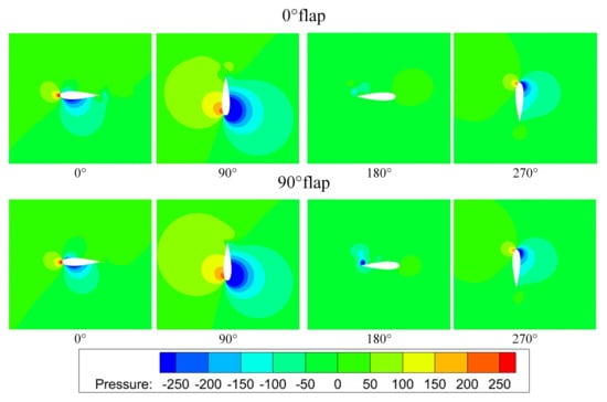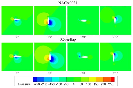 Figure 20 shows the pressure change around the airfoil with the addition of 0.5%c trailing edge flaps. At azimuth angle of 0°, the negative pressure area inside the blade spreads to the inside of the wind wheel. During the 0–90° rotation, the negative pressure zone and high pressure zone spread to both sides of the blade. At 90°, the trailing edge flap increases the pressure difference on both sides of the blade, and the negative pressure extends to the trailing edge of the blade. When the blade continues to rotate, at 180°, the flap creates a dark blue negative pressure vortex on the trailing edge of the blade. When the blade rotates to 270°, the negative pressure area outside the blade increases, and the pressure difference becomes larger, which is beneficial to the offshore wind turbine to obtain lift.