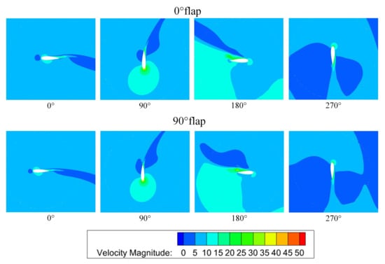 Figure 26 shows the comparison of the velocity clouds around the blades with 0° flaps and 90° flaps at 9 m/s. At azimuth angle of 0°, the blades with 0° flaps are affected by the flaps, causing the high-speed vortex at the outer tail of the blade to be somewhat turbulent, and the flaps obstruct the wind more obviously. When the azimuth angle is 90°, the high-speed vortex at the front end of the blade of the 90° flap is slightly reduced, and the low-speed area on the outside extends to the tail. When the blade rotates to 180°, the low-speed region of the trailing edge of the 90° flap is concentrated at the trailing edge flap. The inner side of the blade is covered by the high-intensity high-speed flow, and the low-speed region on the outer side of the blade has a wider range, which is conducive to the large size of the blade. At this time, the trailing edge of the blade with the 0° flap has obvious low-speed vortices. At azimuth angle of 270°, the high-speed vortex on the outside of the blade is slightly reduced, while the low-speed vortex extends to the outside.