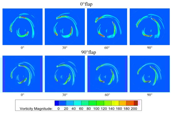 Figure 27 shows the comparison of the vorticity field in a cycle inside the offshore wind turbine blades with 0° flaps and 90° flaps.